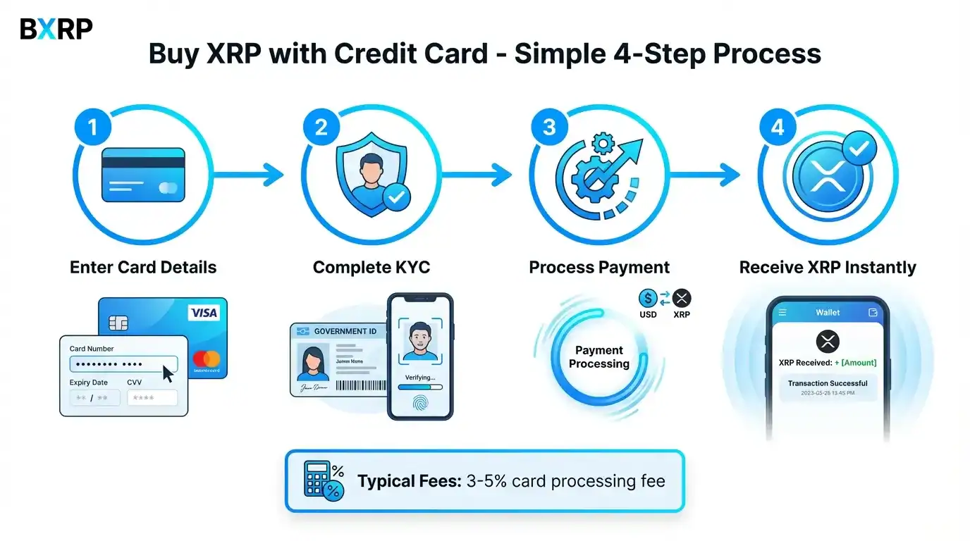 Step-by-step process to buy XRP with a credit card showing card entry, KYC verification, and instant XRP delivery with fee breakdown